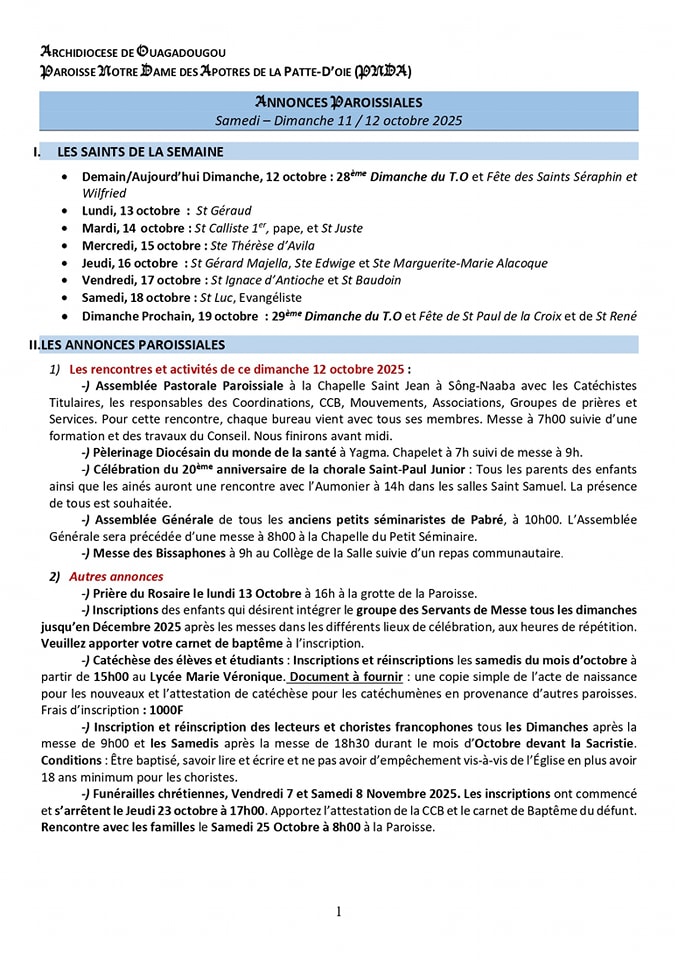 โช๏ธDemain/Aujourdโhui Dimanche, 12 octobre : 28รจme Dimanche du T.O et Fรชte des Saints Sรฉraphin et Wilfried