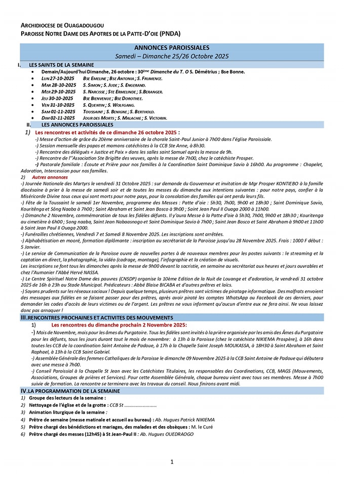 Sur demande du Gouverneur et invitation de Mgr Prosper KONTIEBO, la famille diocรฉsaine est invitรฉe ร  prier ร  la messe de samedi soir et ร  toutes les messes du dimanche pour :