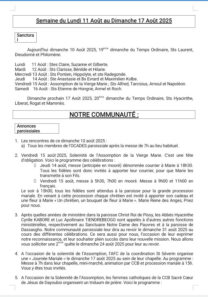A lโoccasion de la Solennitรฉ de lโAssomption, les femmes catholiques de la CCB Sacrรฉ Cลur de Jรฉsus de Dayoubsi organisent un triduum de priรจre. Voici le programme :