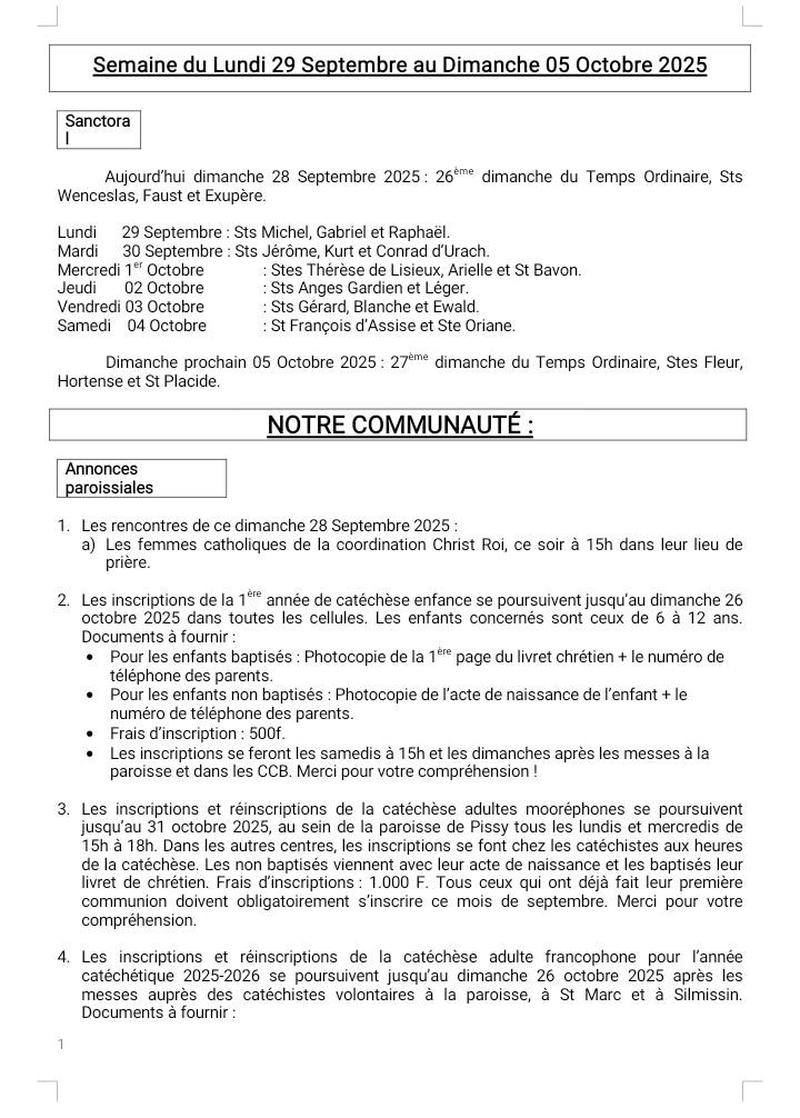 Les inscriptions et rรฉinscriptions de la catรฉchรจse adultes moorรฉphones se poursuivent jusquโau 31 octobre 2025, au sein de la paroisse de Pissy tous les lundis et mercredis de 15h ร 18h. Dans les autres centres, les inscriptions se font chez les catรฉchistes aux heures de la catรฉchรจse. Les non baptisรฉs viennent avec leur acte de naissance et les baptisรฉs leur livret de chrรฉtien. Frais dโinscriptions : 1.000 F. Tous ceux qui ont dรฉjร fait leur premiรจre communion doivent obligatoirement sโinscrire ce mois de septembre. Merci pour votre comprรฉhension.