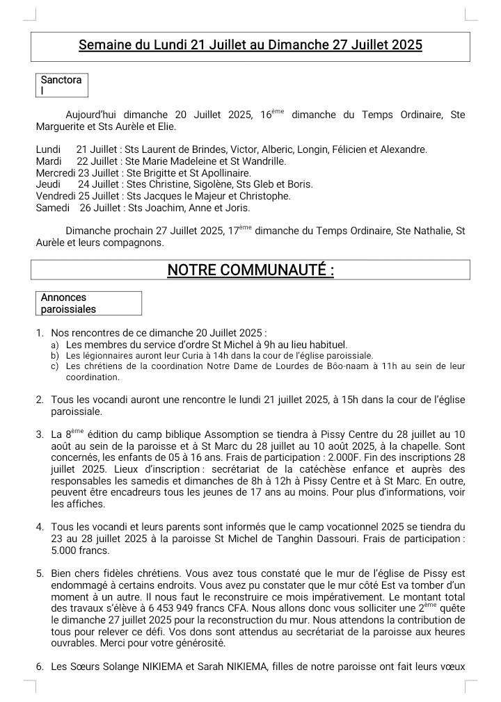 Bien chers fidรจles chrรฉtiens. Vous avez tous constatรฉ que le mur de lโ€™รฉglise de Pissy est endommagรฉ ร  certains endroits. Vous avez pu constater que le mur cรดtรฉ Est va tomber dโ€™un moment ร  un autre. Il nous faut le reconstruire ce mois impรฉrativement. Le montant total des travaux sโ€™รฉlรจve ร  6 453 949 francs CFA. Nous allons donc vous solliciter une 2รจme quรชte le dimanche 27 juillet 2025 pour la reconstruction du mur. Nous attendons la contribution de tous pour relever ce dรฉfi. Vos dons sont attendus au secrรฉtariat de la paroisse aux heures ouvrables. Merci pour votre gรฉnรฉrositรฉ.