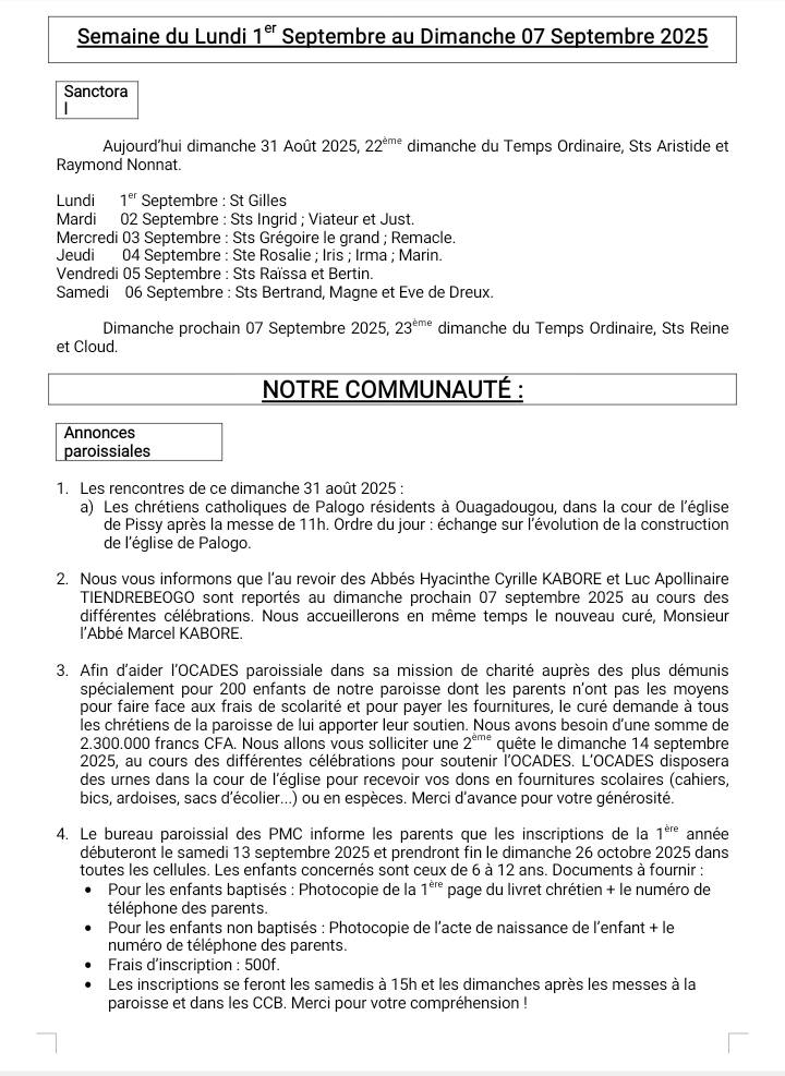 Nous vous informons que lโau revoir des Abbรฉs Hyacinthe Cyrille KABORE et Luc Apollinaire TIENDREBEOGO sont reportรฉs au dimanche prochain 07 septembre 2025 au cours des diffรฉrentes cรฉlรฉbrations. Nous accueillerons en mรชme temps le nouveau curรฉ, Monsieur lโAbbรฉ Marcel KABORE.