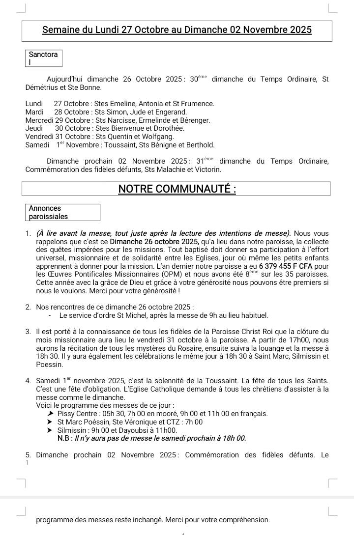 Nous vous informons que la messe des funรฉrailles chrรฉtiennes aura lieu le samedi 08 novembre 2025 ร 08H. La veillรฉe de priรจre est fixรฉe pour le vendredi 07 Novembre ร 20H, ร Pissy-Centre, ร St Marc et ร Silmissin. Pour nous permettre dโorganiser les cรฉlรฉbrations des funรฉrailles chrรฉtiennes, le curรฉ demande aux responsables des CCB de lui faire parvenir au plus tard le lundi 03 novembre 2025, la liste des personnes concernรฉes. Toutes les familles qui ont demandรฉ une messe pour un membre dรฉfunt sont priรฉes dโenvoyer deux reprรฉsentants ร une rencontre qui aura lieu le mardi 04 novembre 2025 ร Pissy-centre avec Monsieur le Curรฉ ร 8h00.