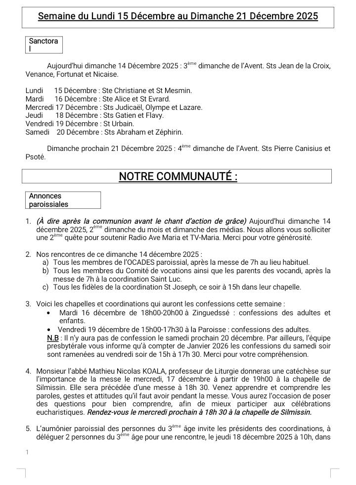N.B : Il nโy aura pas de confession le samedi prochain 20 dรฉcembre. Par ailleurs, lโรฉquipe presbytรฉrale vous informe quโร compter de Janvier 2026 les confessions du samedi soir sont ramenรฉes au vendredi soir de 15h ร 17h 30. Merci pour votre comprรฉhension.