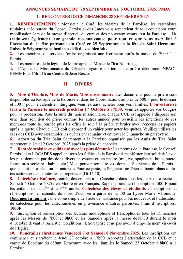 ๐—˜๐—ป๐—ณ๐—ฎ๐—ป๐—ฐ๐—ฒ : rentrรฉe des enfants ร  la Catรฉchรจse dans tous les lieux de catรฉchรจse. Samedi 4 Octobre 2025 : en Moorรฉ et en Franรงais. Rappel ; frais de rรฉinscriptions 500 F pour les enfants de la 2รจme ร  la 6รจme annรฉe.
