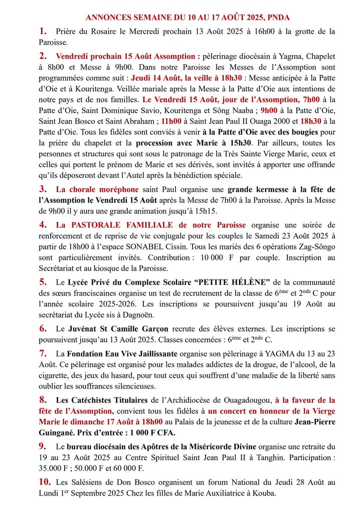 ๐ต๏ฝก ๐๐ฒ ๐ฏ๐๐ฟ๐ฒ๐ฎ๐ ๐ฑ๐ถ๐ผ๐ฐรฉ๐๐ฎ๐ถ๐ป ๐ฑ๐ฒ๐ ๐๐ฝรด๐๐ฟ๐ฒ๐ ๐ฑ๐ฒ ๐น๐ฎ ๐ ๐ถ๐รฉ๐ฟ๐ถ๐ฐ๐ผ๐ฟ๐ฑ๐ฒ ๐๐ถ๐๐ถ๐ป๐ฒ ๐ผ๐ฟ๐ด๐ฎ๐ป๐ถ๐๐ฒ ๐๐ป๐ฒ ๐ฟ๐ฒ๐๐ฟ๐ฎ๐ถ๐๐ฒ du 19 au 23 Aoรปt 2025 au Centre Spirituel Saint Jean Paul II ร Tanghin. Participation : 35.000 F ; 50.000 F et 60 000 F.