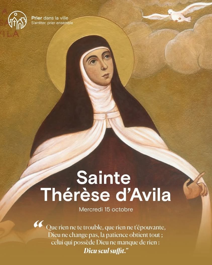 đź’› 15 octobre – Sainte ThĂ©rèse d’Avila : femme de feu, d’oraison et d’audace ! Aujourd’hui encore, elle nous murmure : « Dieu seul suffit. »