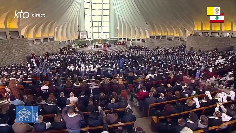 🔴 Le pape #LéonXIV rencontre les évêques, prêtres, religieux et laïcs engagés du #Liban au sanctuaire Notre-Dame-du-Liban, à Harissa.