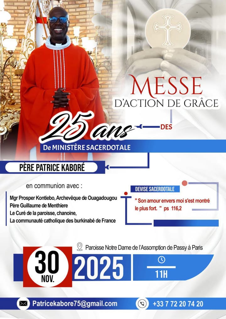 C’est avec une grande joie que nous partageons cette belle annonce : le Père Patrice Kaboré célébrera ses 25 ans de sacerdoce lors d’une messe d’action de grâce, entouré de la communauté catholique et de ses confrères.