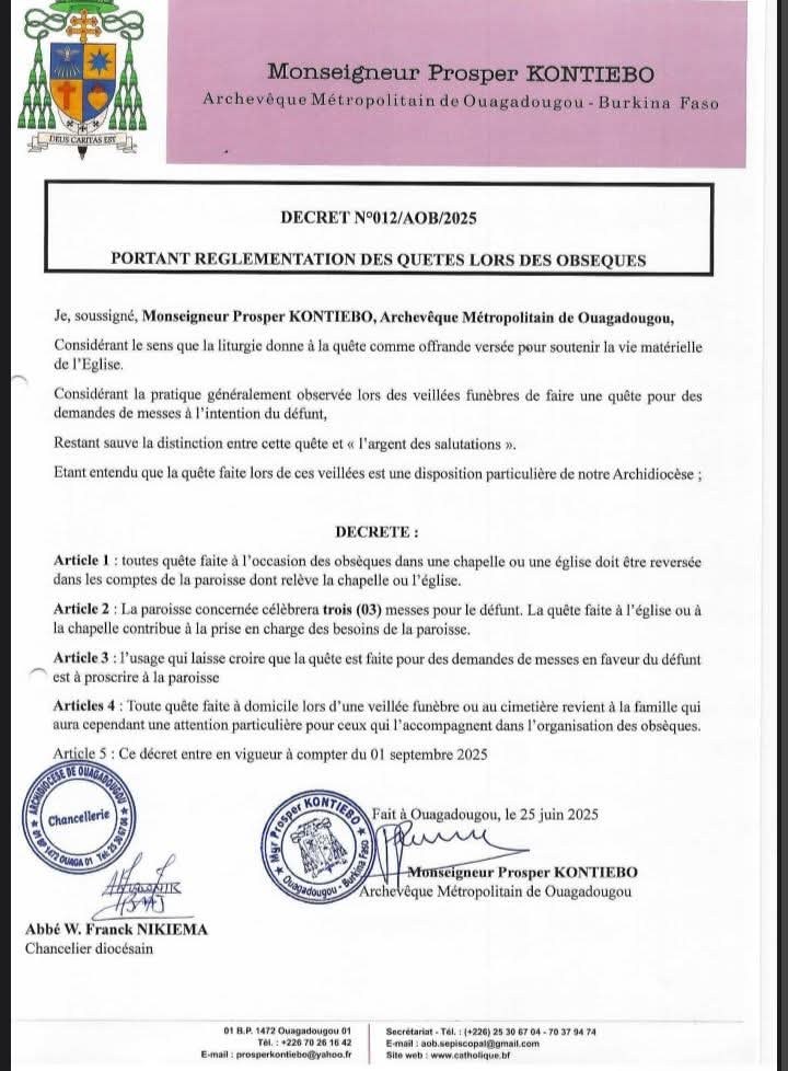 Décret de l’Archidiocese de Ouagadougou portant réglementation des quêtes lors des Obsèques.