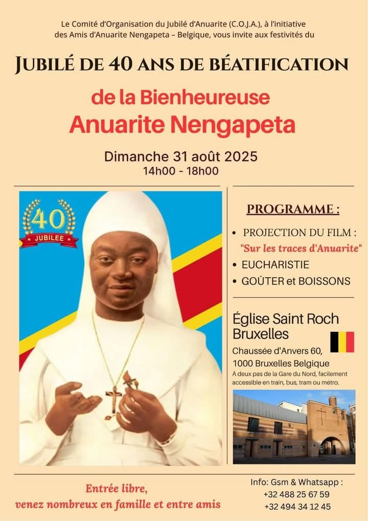 Nous: le Comité d’Organisation du Jubilé d’Anuarite (C.O.J.A.); à l’initiative des Amis d’Anuarite Nengapeta Belgique, avons la joie de vous inviter à une grande célébration à l’occasion du 40ème anniversaire de béatification de la Bienheureuse Anuarite Marie-Clémentine Nengapeta: