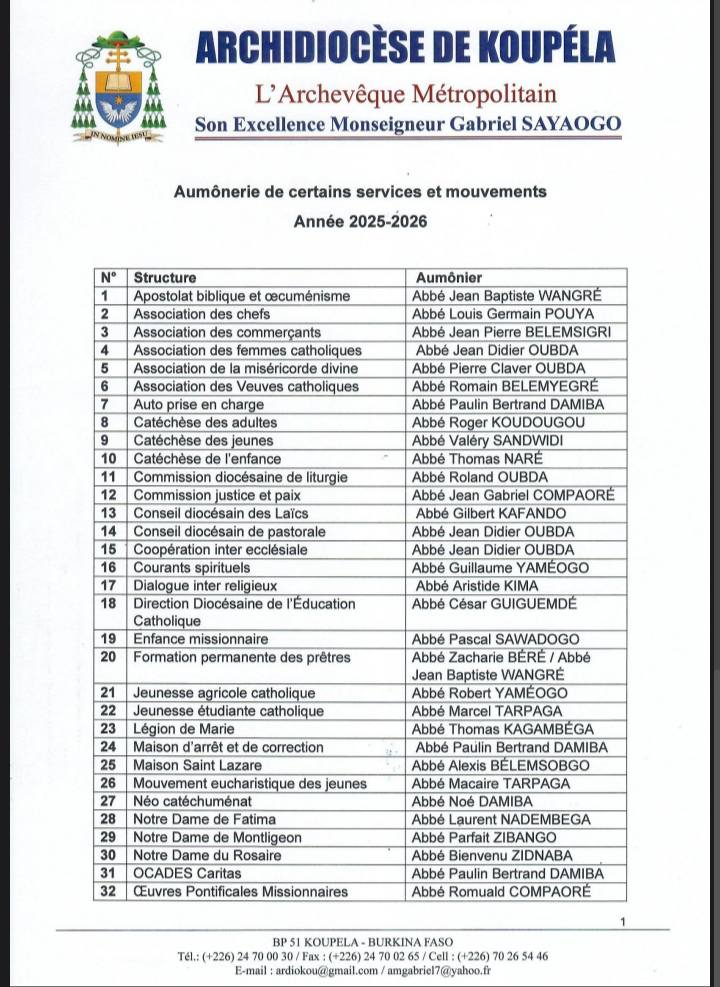 Mouvement du personnel ecclésiastique de l’archidiocèse de Koupéla. Services diocèsain.