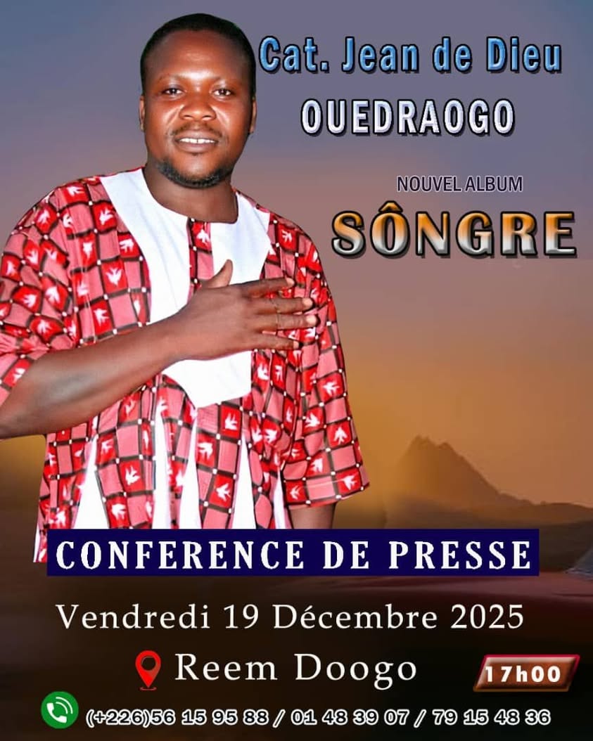 Le catéchiste Jean de Dieu OUEDRAOGO vous convie à sa conférence de presse pour la sortie officielle de son nouvel album intitulé » SÔNGRE » le #vendredi_19_décembre_2025 à #17h00 à l’espace culturel #Reem_Doogo situé à Gounghin