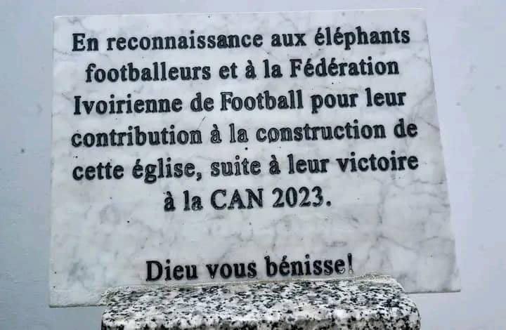 Pour matérialiser cette reconnaissance, une plaque commémorative a été dévoilée. Elle rend hommage aux Éléphants et à la Fédération Ivoirienne de Football pour leur contribution à la construction de l’église, suite à leur victoire à la CAN 2023.