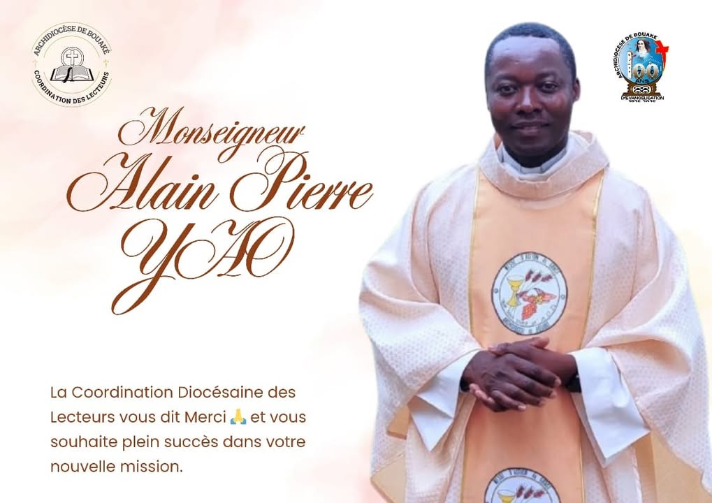Précédemment Aumônier Diocésain des Lecteurs de l’archidiocèse de Bouaké, Mgr Alain Pierre YAO, également Vicaire Général a été nommé Recteur du Grand Séminaire de Guessiho à Gagnoa. Suite à cette distinction, la coordination diocésaine des lecteurs de Bouaké a adressé ses félicitations chaleureuses à leur accompagnateur spirituel pour cette nouvelle responsabilité.