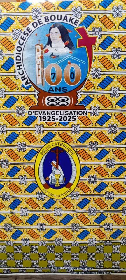 Pour l’année pastorale 2025-2026, le pagne rend hommage au centenaire de l’évangélisation de Bouaké, a constaté #Catholikia . C’est l’événement religieux majeur. L’archidiocèse de Bouaké est ainsi placé au cœur de cette édition, comme témoin de la mission évangélisatrice de l’Église en Côte d’Ivoire.