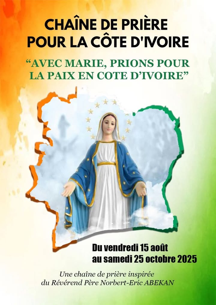 Parce que la paix s’obtient aussi par la prière, la Commission Episcopale Justice, Paix et Environnement propose d’organiser une chaine de prière pour la paix en Côte d’Ivoire, du 15 août au 25 octobre 2025. Pendant dix semaines, unis à Notre-Dame de la Paix, nous prierons pour demander au Seigneur la paix pour notre pays.