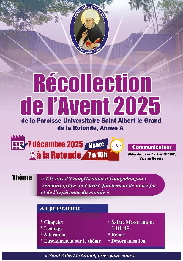 Deuxième dimanche de l’Avent, Année A: Recollection communautaire de de la Paroisse universitaire Saint Albert le Grand de la Rotonde autour du thème: « 125 ans d’évangélisation à Ouagadougou: rendons grâce au Christ, fondement de notre foi et de l’espérance du monde ».