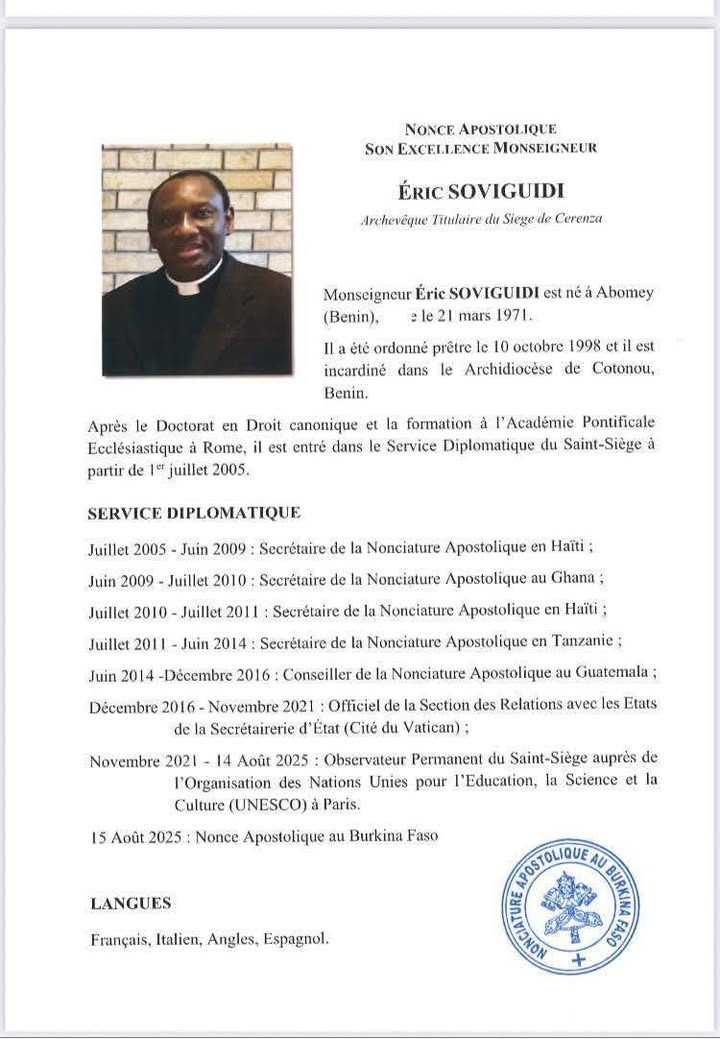 La Conférence Épiscopale Burkina-Niger est heureuse d’annoncer que le Saint-Père, le Pape Léon XIV, a nommé Son Excellence Monseigneur Éric SOVIGUIDI comme Nonce Apostolique auprès du Burkina Faso.