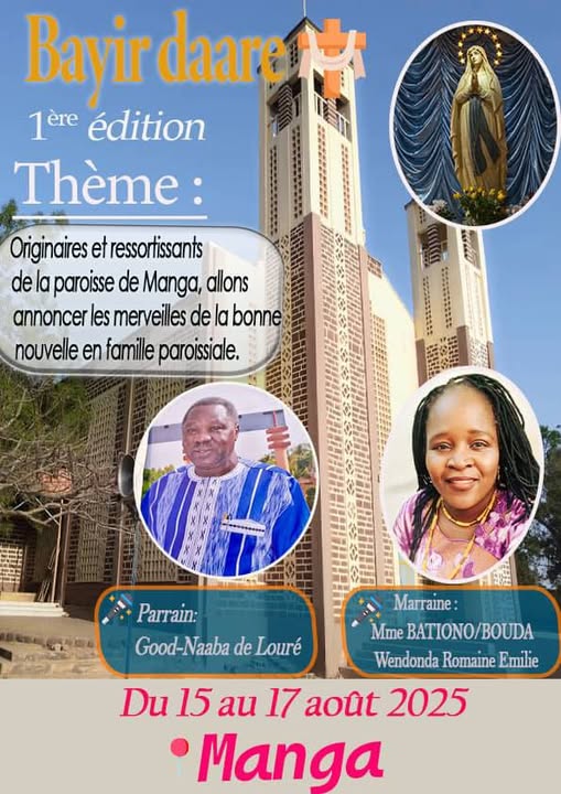 La paroisse Cathédrale Notre-Dame de l’Assomption de MANGA vous invite à sa fête patronale et au Bayir -dāaré des ses fils et filles résidents à Ouagadougou et ailleurs du 15 au 17 Août 2025.