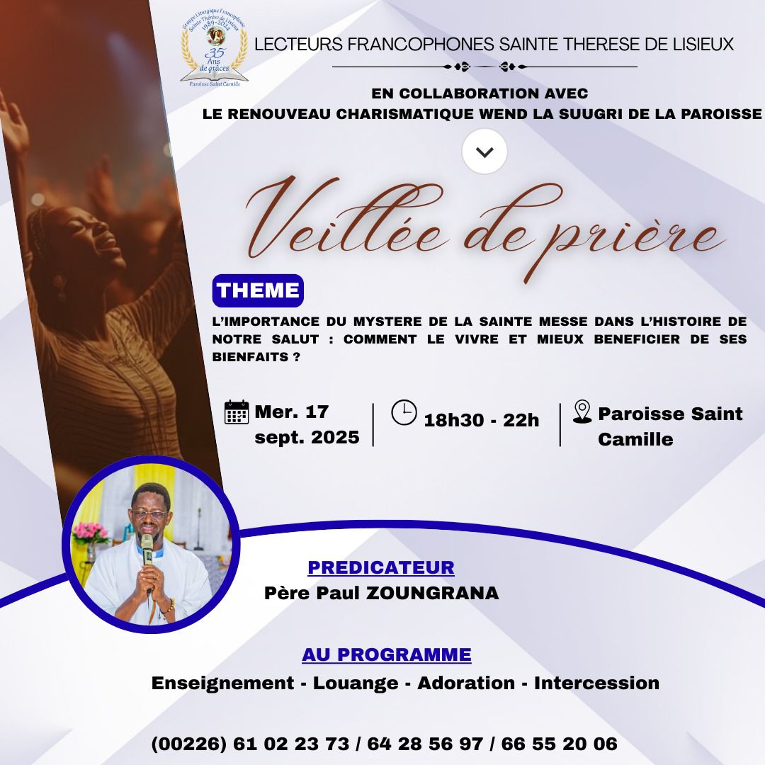 Le. Groupe liturgique sainte Thérèse de Lisieux de la Paroisse Saint Camille Dagnoë en collaboration avec le Renouveau Charismatique catholique Wend-la-suugri nous donne rendez-vous ce mercredi 17 septembre 2025 à partir de 18h pour un temps de grâce. Soyons au rendez-vous.