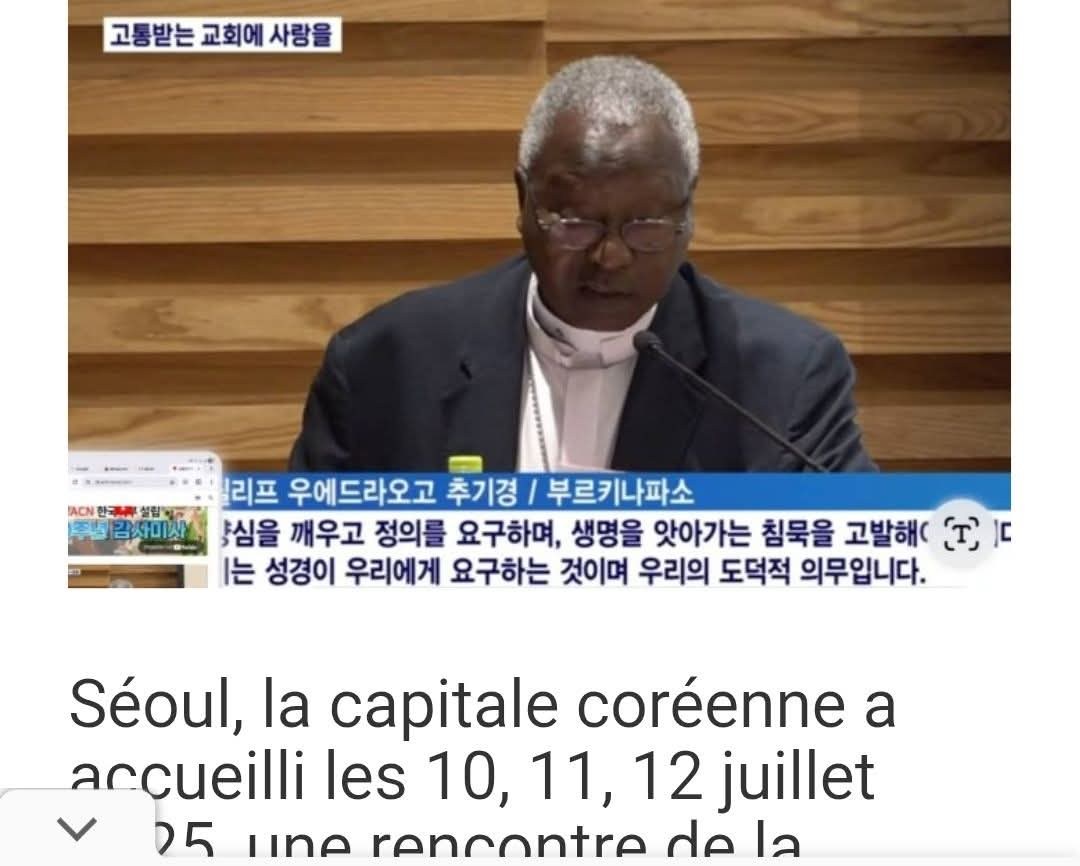 Séoul, la capitale coréenne a accueilli les 10, 11, 12 juillet 2025, une rencontre de la fondation pontificale Aide à l’Église en détresse. A cette occasion, le Cardinal Philippe Ouédraogo, l’un des principaux intervenants, a adressé un message très poignant sur la situation sécuritaire du Burkina Faso et du Sahel : « Ne tombons pas dans le piège : refusons la peur, l’amalgame, le discours de division. Le conflit actuel n’est pas religieux. Il est politique, économique, identitaire, géostratégique », prévient l’archevêque émérite de Ouagadougou qui interpelle : « Comment expliquer que tant d’armes circulent dans des zones où l’accès à la nourriture et à l’eau potable est limité ? Qui ferme les yeux ? Qui laisse faire ? Qui en profite ? ». Nous vous proposons l’intégralité de sa déclaration sur « L’Église au Burkina Faso, témoin de l’Espérance face à la persécution par l’extrémisme islamiste violent »