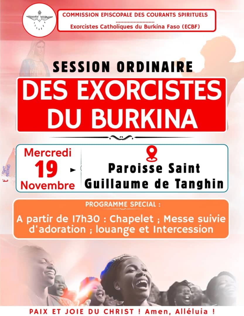 Les prêtres exorcistes de tous les diocèses du Burkina Faso nous donnent rendez-vous ce mercredi 19 novembre 2025 à la Paroisse Saint Guillaume de Tanghin/Ouagadougou à partir de 17h30 pour une speciale soiree de rencontre avec notre Dieu.