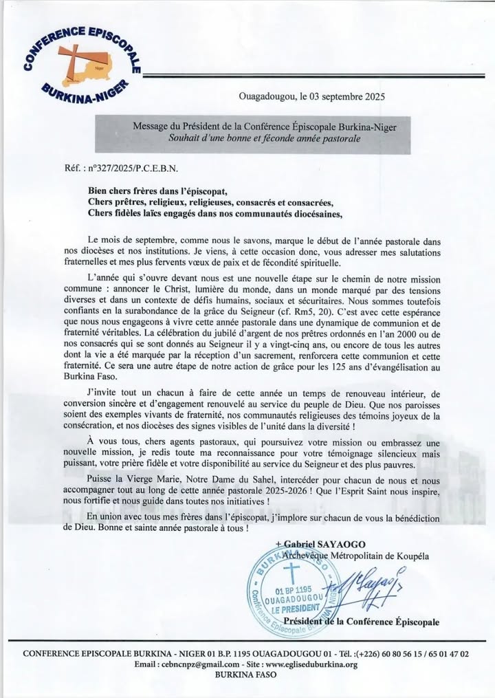 Message de Son Excellence Monseigneur Gabriel SAYAOGO, Archevêque Métropolitain de Koupéla, Président de la Conférence Episcopale Burkina-Niger