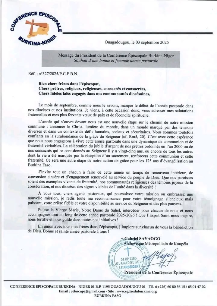 Message du président de la Conférence Épiscopale Burkina-Niger