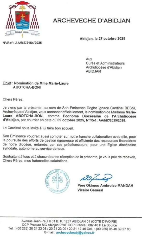 Par un courrier daté du 9 octobre 2025, Son Éminence le cardinal Ignace Bessi Dogbo, archevêque métropolitain d’Abidjan, a nommé Madame Marie-Laure Abotcha-Boni nouvelle économe diocésaine d’Abidjan.