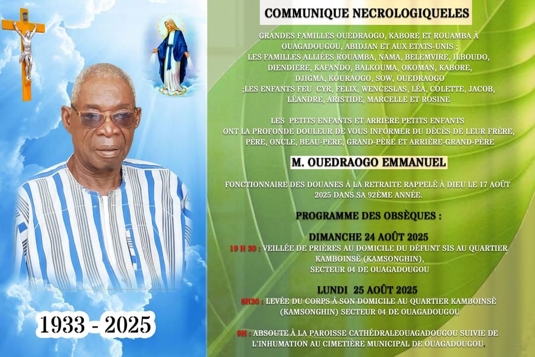 Nous avons appris ce jour le décès de Monsieur OUEDRAOGO Emmanuel, grand frère aîné de notre doyen des administrateurs le chef Antoine Ouedraogo .