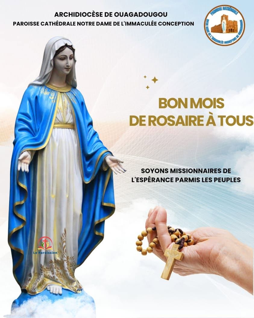 « Ô Marie, Mère très sainte, en ce mois du Rosaire, guide nos pas vers ton Fils Jésus. Apprends-nous à prier avec confiance, à méditer ses mystères avec amour, et à vivre chaque jour dans la lumière de Dieu. Amen »