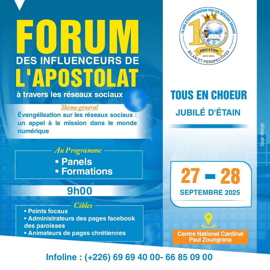 Rendez-vous les 27 et 28 septembre 2025 au Centre National Cardinal Paul Zoungrana a partir de 9h pour ce Jubilé d’étain riche en enseignements et en perspectives pour l’évangélisation numérique. Ensemble, faisons résonner la voix de Dieu sur les réseaux sociaux !