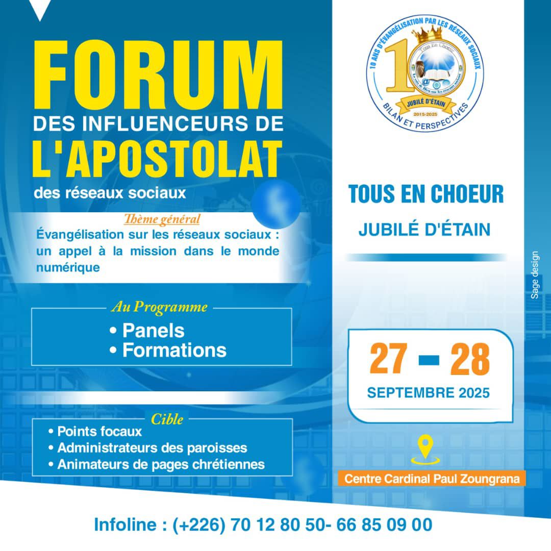 Rendez-vous les 27 et 28 septembre 2025 au Centre National Cardinal Paul Zoungrana pour ce Jubilé d’étain riche en enseignements et en perspectives pour l’évangélisation numérique. Ensemble, faisons résonner la voix de Dieu sur les réseaux sociaux !