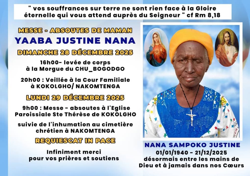 Programme des obsèques de la maman du Père Gaëtan G KABORÉ, Curé de la paroisse Saint Camille.