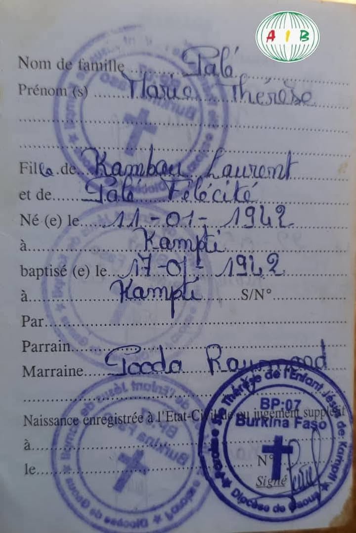 Née le 11 janvier 1942 à Kampti-Bouti, Marie Thérèse Palé fut baptisée dans son berceau le 17 janvier 1942, soit six jours après sa naissance. Cet acte de foi, inédit à l’époque, fit d’elle le tout premier bébé lobi baptisé dans la Mission catholique de Kampti, grâce à la ferveur religieuse de ses parents, Laurent Kambou et Félicité Palé.