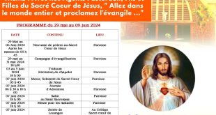 Archidiocèse de OuagadougouParoisse Sacré-Cœur de Jésus de DapoyaFête paroissiale et Journée des communautés Thème :Avec nos agents pastoraux, fils et filles du Sacré-Cœur de Jésus : « Allez dans le monde entier et proclamez l’évangile… » Programme du 29 mai au 09 juin 2024 29 mai au 06 juin 2024Après les messes de 05h45→ Neuvaine de prières au Sacré-Cœur de Jésus (Lieu …